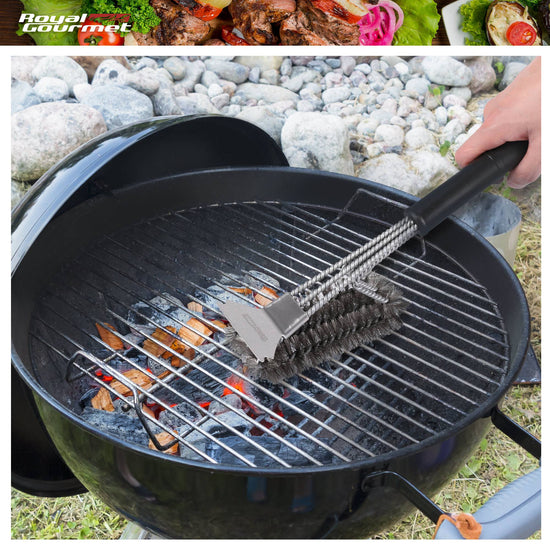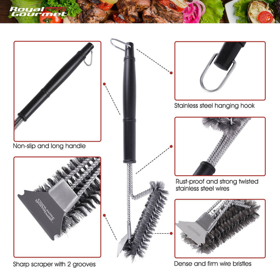 Eliminate food debris from the grill easily with Royal Gourmet TB1707 Grill Cleaning Brush and Scraper. Featuring intense cleaning power by effortless handle and dense wire bristles, this grill cleaning brush combined with strong scraper removes buildup in no time and helps tackle tough burnt-on food with ease. It is time to throw out your old grill cleaning brush! Our grill cleaning brush is definitely the best BBQ-aid for your troubling cleaning job. Get rid of worries about bristles falling out and clean all types of grills in a healthy and safe way!