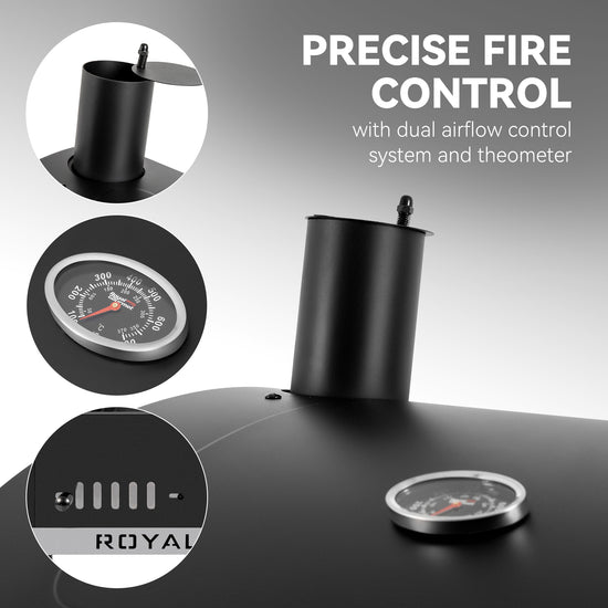 4. Professional Temperature Control: A lid-mounted stainless steel thermometer monitors temperature precisely in real-time, while 2-level height-adjustable charcoal pan, 2 adjustable air vents and a stack allow for exceptional temperature control.