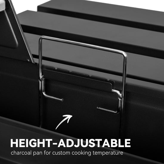5. Height-adjustable Charcoal Pan: With two 2-level lifting handles, the height-adjustable charcoal pan easily controls the distance between charcoal and food to maintain desired grilling temperature, allowing you to achieve perfectly cooked foods.
