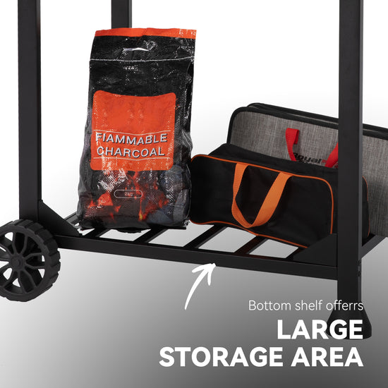 2. Ample Prep & Storage Space: 2 side shelves provide extra prep or working space, holding your seasonings, plates and grilling tools for quick and easy access. A large bottom shelf is perfect for accommodating big bags of charcoal, grilling utensils and much more.