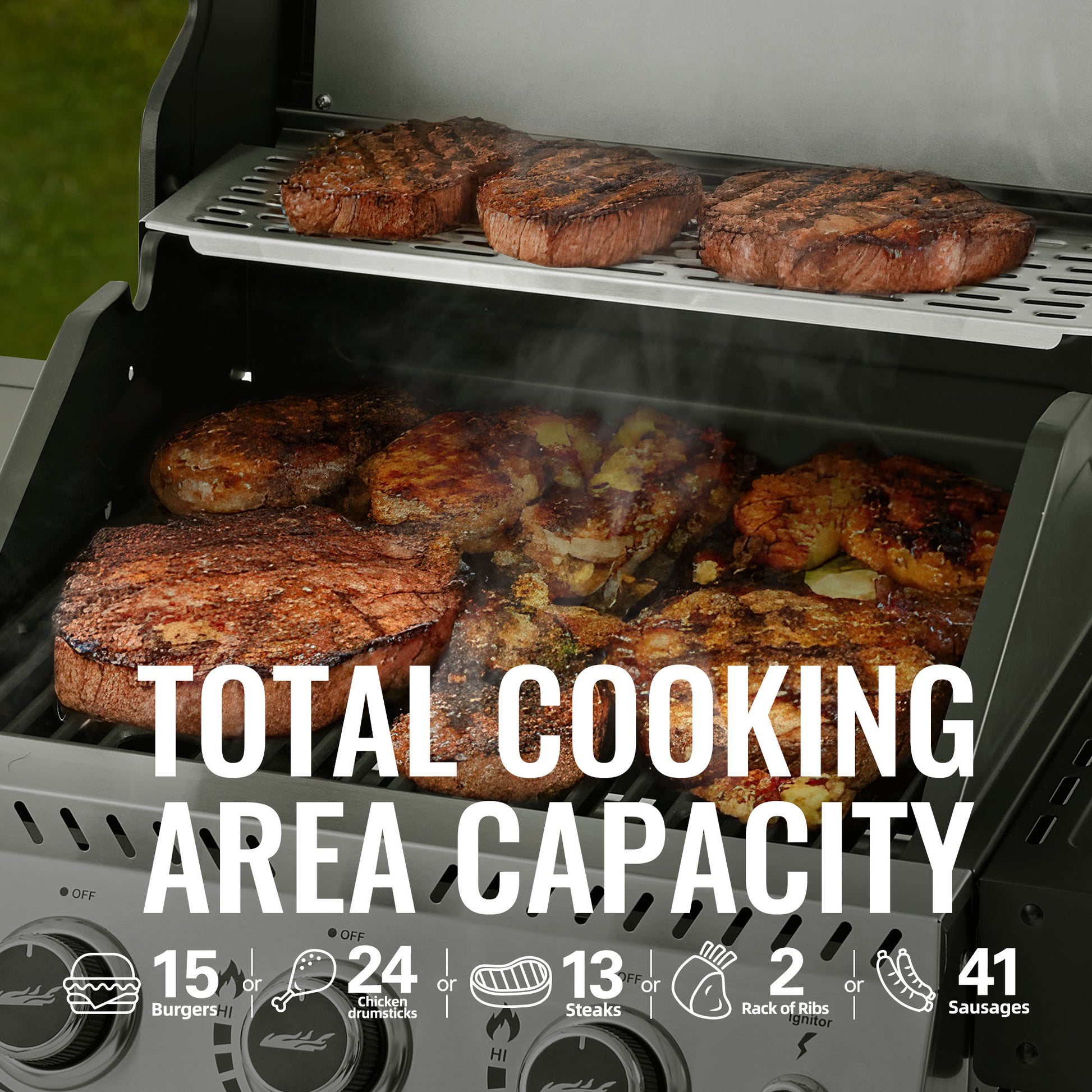 Generous Cooking Area: With a total of 399 sq. in. cooking area, including 83 sq. in. warming rack area and 316 sq. in. primary cooking area, this grill can cook up to 15 burgers at once.