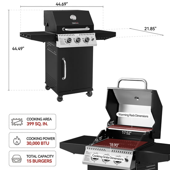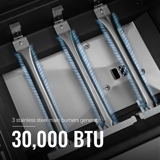 Consistent & Even Heat: Three stainless-steel burners deliver a total of 30,000 BTU of robust cooking power, providing consistent, even heat across the entire grilling area.