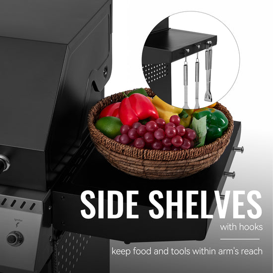 Extra Prep Space: Two side shelves offer ample food-prep space and keep essentials within arm’s reach, while three integrated hooks on each side provide quick access to your grilling accessories.