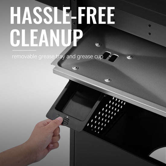 Hassle-free Cleanup: The effective grease management system, including removable grease tray and draw-out grease cup, allows you to easily dispose of grease and food residue.