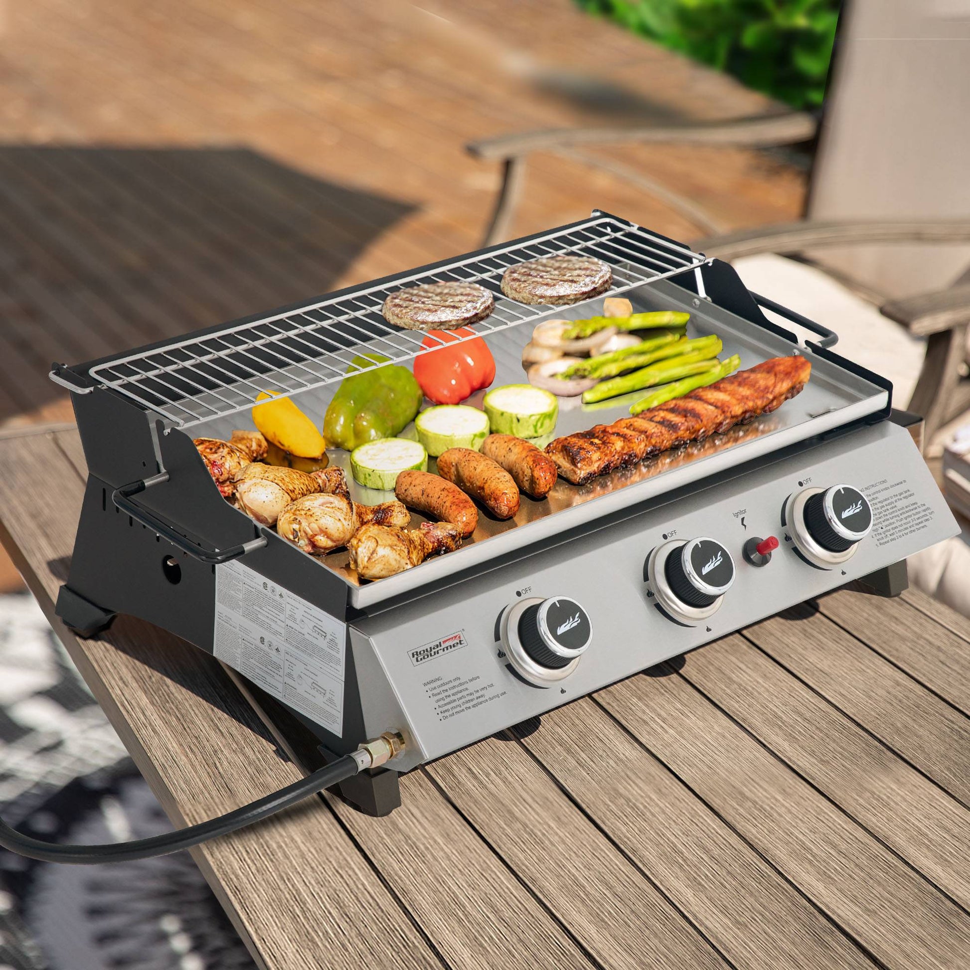 Elevate your outdoor cooking experience with this Royal Gourmet 3-Burner Portable Gas Griddle with Warming Rack. Start your day by cooking breakfast staples such as eggs, pancakes and bacon. Transition to lunch with classic options like burgers and hot dogs or get creative with dishes like spaghetti. The compact and portable design of this griddle makes it perfect for taking with you to the race track, tailgate, campsite - wherever your adventures lead. Believe the magic and endless possibilities on this portable griddle.