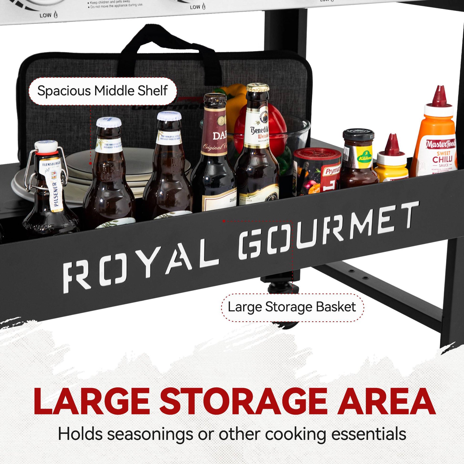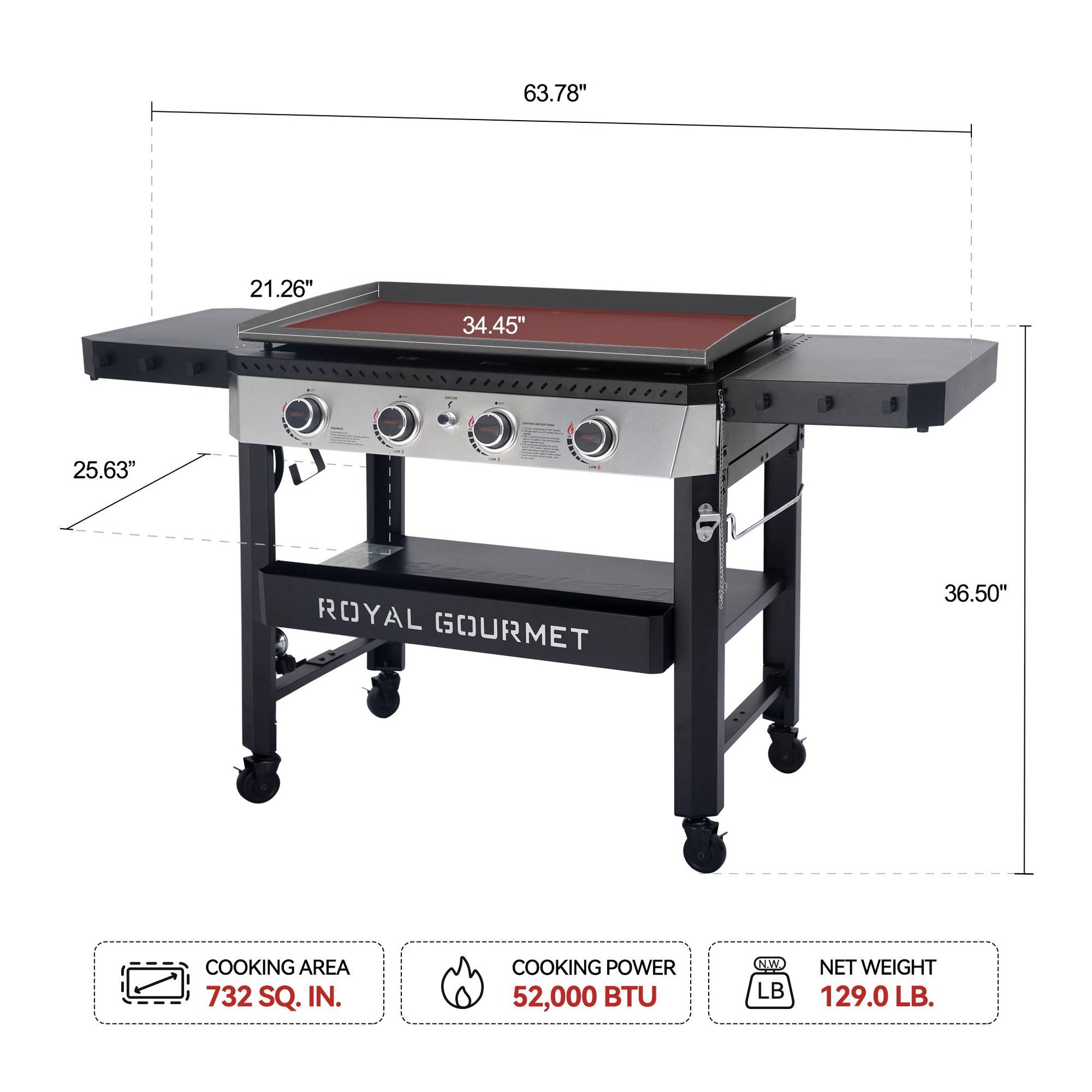 Royal Gourmet GB4007 4-Burner Propane Gas Griddle is your ultimate companion to light up your outdoor cooking game. This griddle features a spacious 732 sq. in. cooking area and an impressive 52000 BTU total cooking power generated by 4 stainless steel burners, providing you with seamless cooking experience. Besides, it features multiple storage solutions for ultimate convenience. Enjoy unparalleled organization with collapsible side shelves equipped with hooks, a front basket, a large middle shelf and a handy paper towel holder.