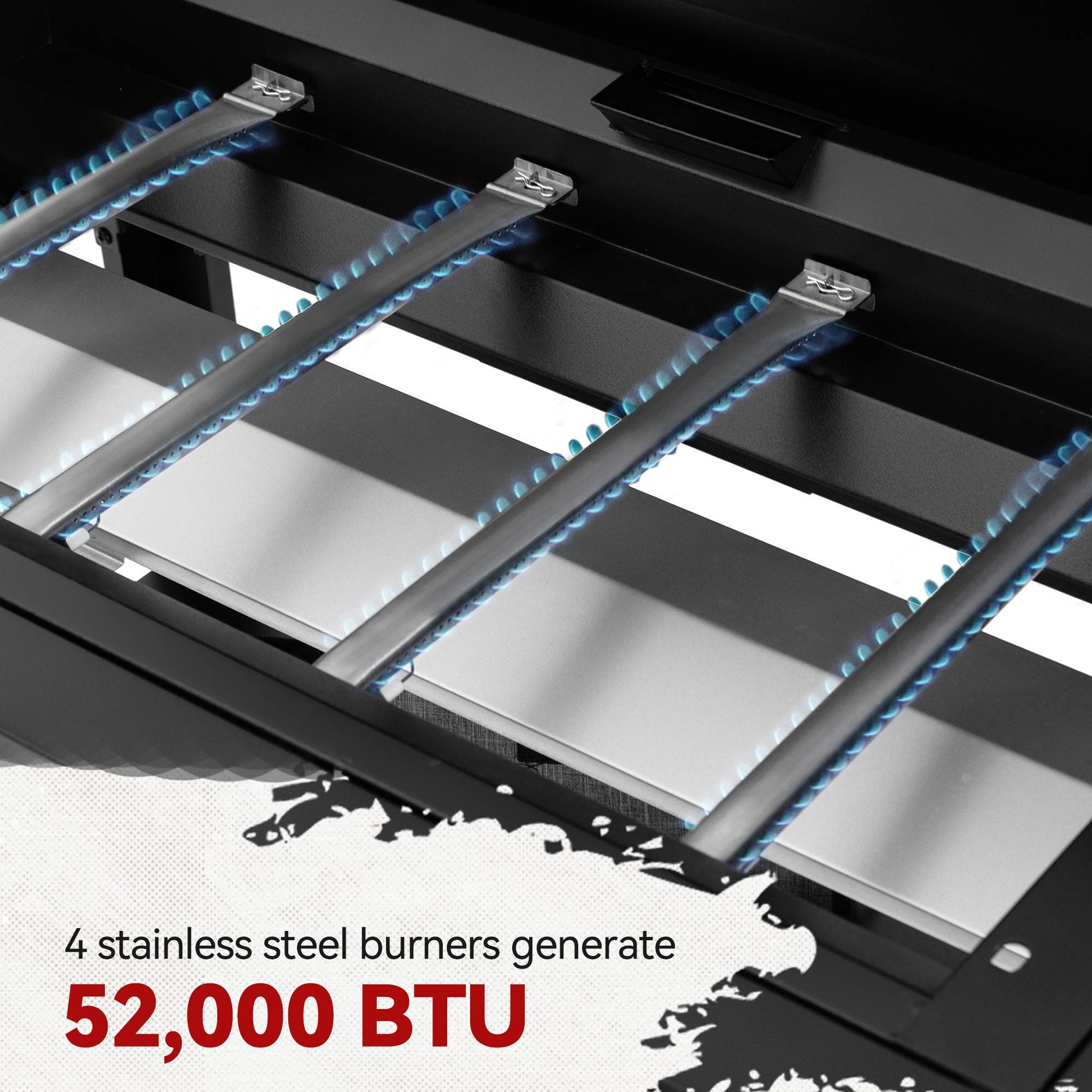 ·4 stainless steel burners provide a total of 52,000 BTU cooking power