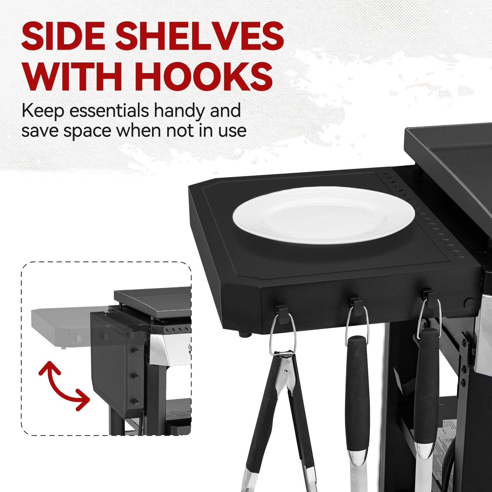 ·Two collapsible side shelves provide space for food preparation and compact storage
