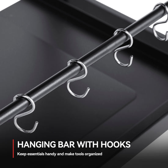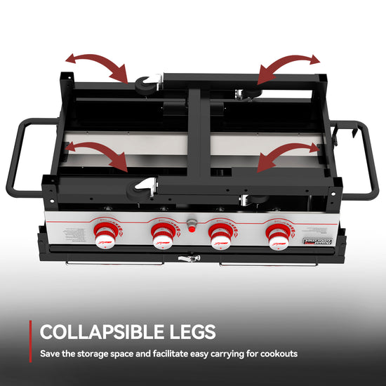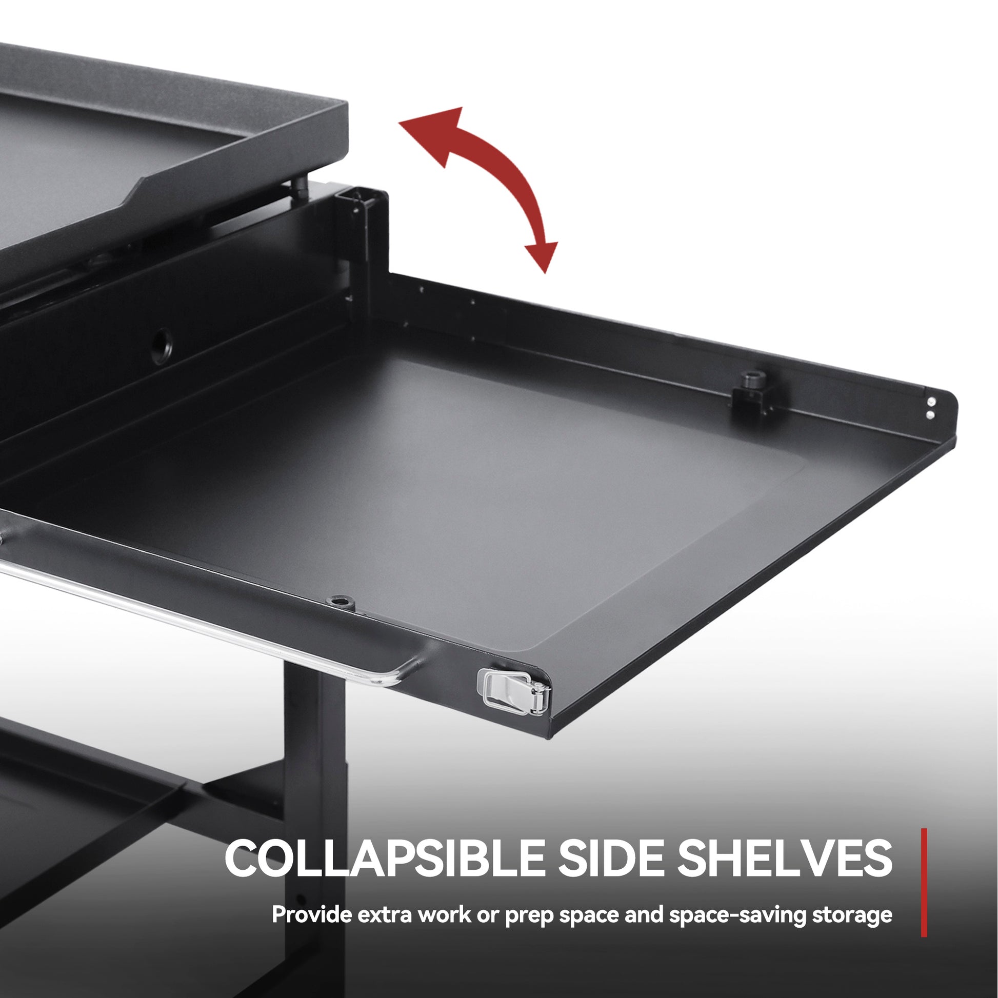 5.?Dual Collapsible?Side Shelves: Lay down dual side shelves to the left and right sides respectively as work space when grilling or fold vertically to cover the whole cooking flat top for easy storage and protective transport.