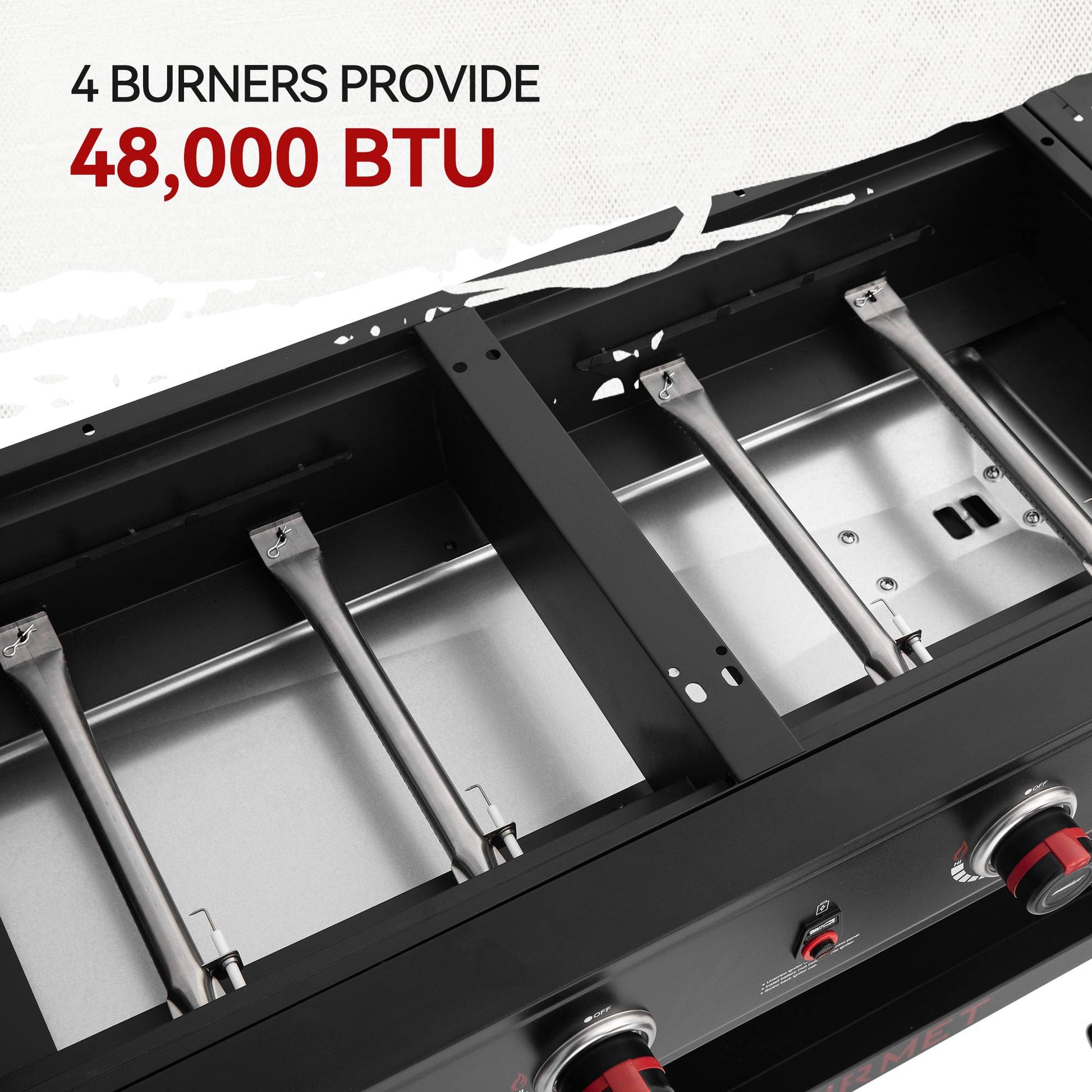 - High Performance: With 4 independently controlled burners, this grill provides 48,000 BTU cooking power and even heat distribution across both the grill and griddle surfaces, allowing you to cook multiple items simultaneously.