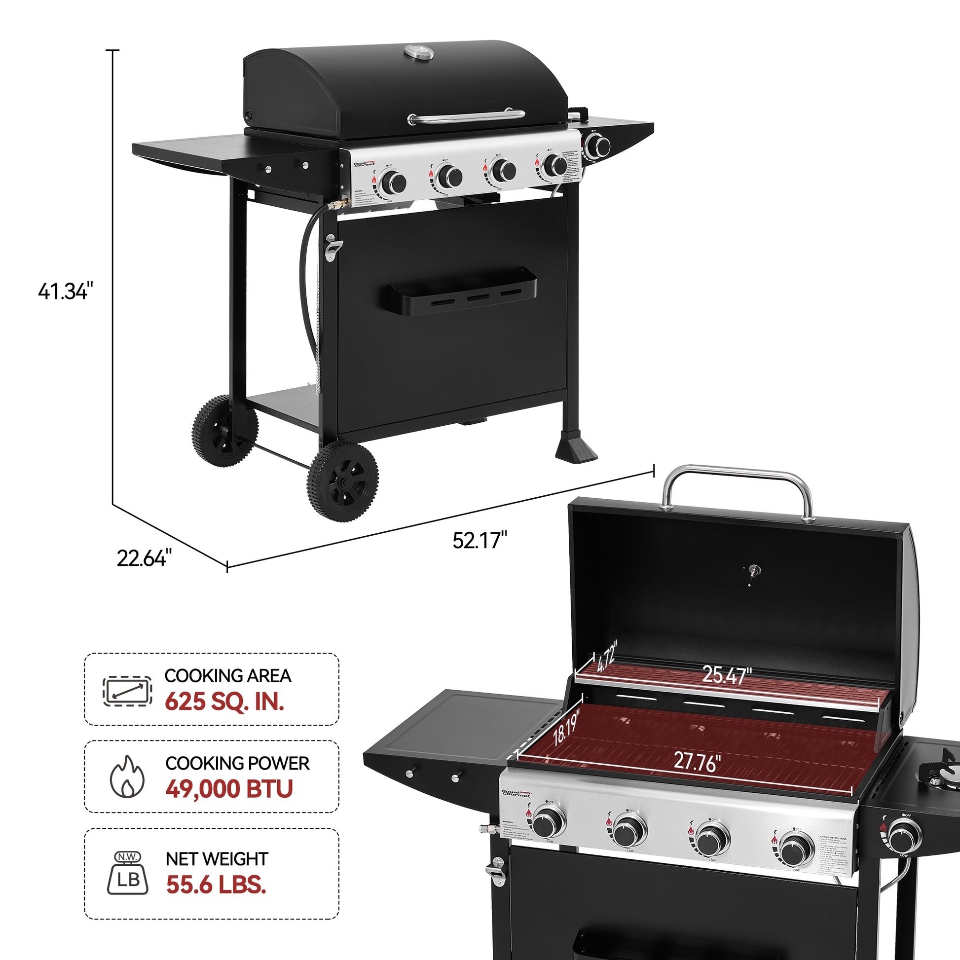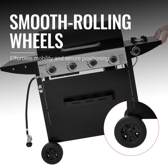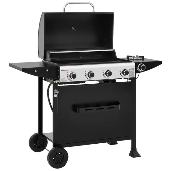 This Royal Gourmet® GH4001H 4-Burner Gas Grill with Side Burner is your reliable companion for every barbecue. Fire it up and showcase your skills—your guests will be impressed. Whether on the patio, in the backyard, or on the balcony, this grill brings people together around sizzling steaks and juicy burgers under warm sunlight. Thoughtfully designed with a front spice rack, side shelf with hooks, and built-in bottle opener, the GH4001H blends style, function, and convenience. Choose Royal Gourmet® GH4001H and make every BBQ a memorable experience.