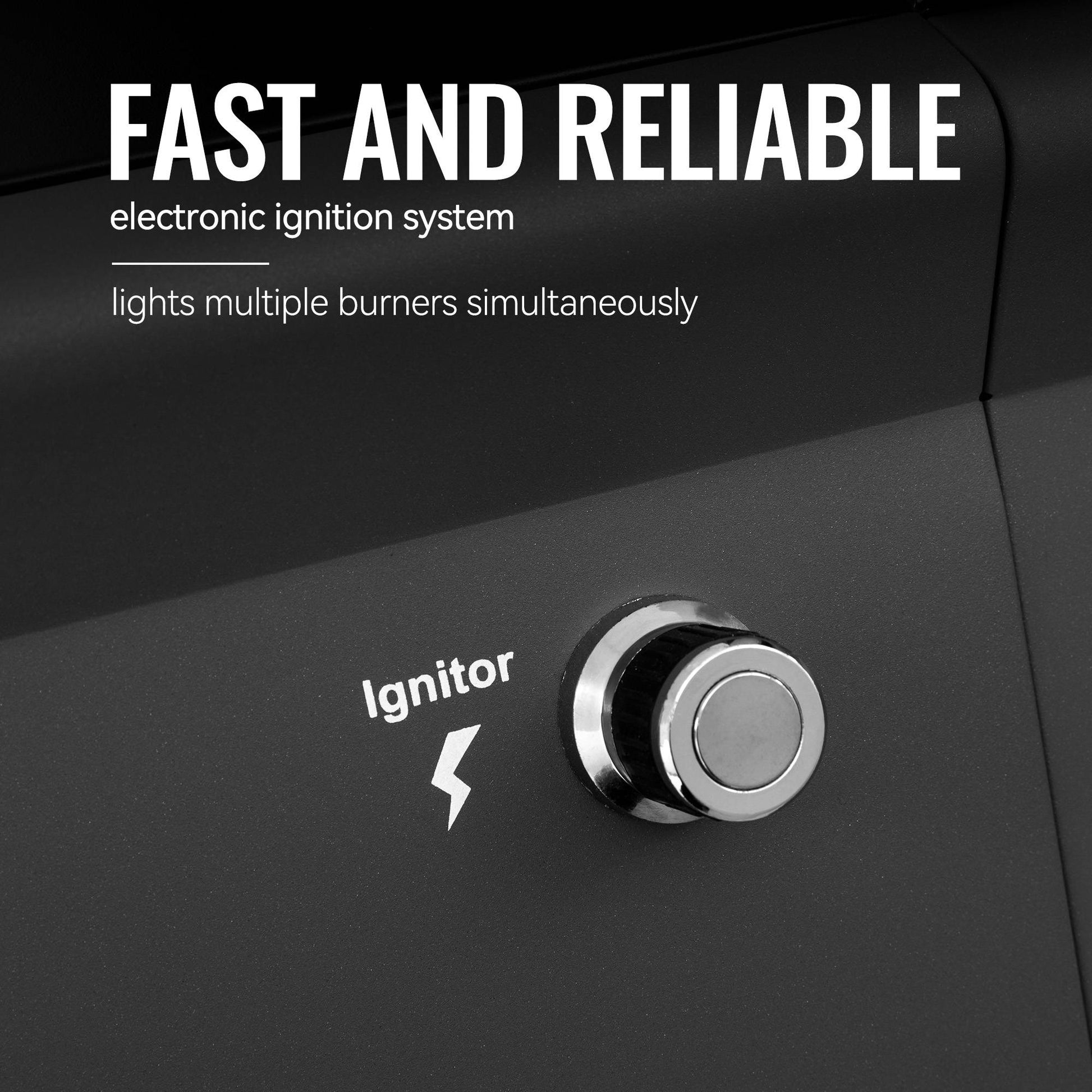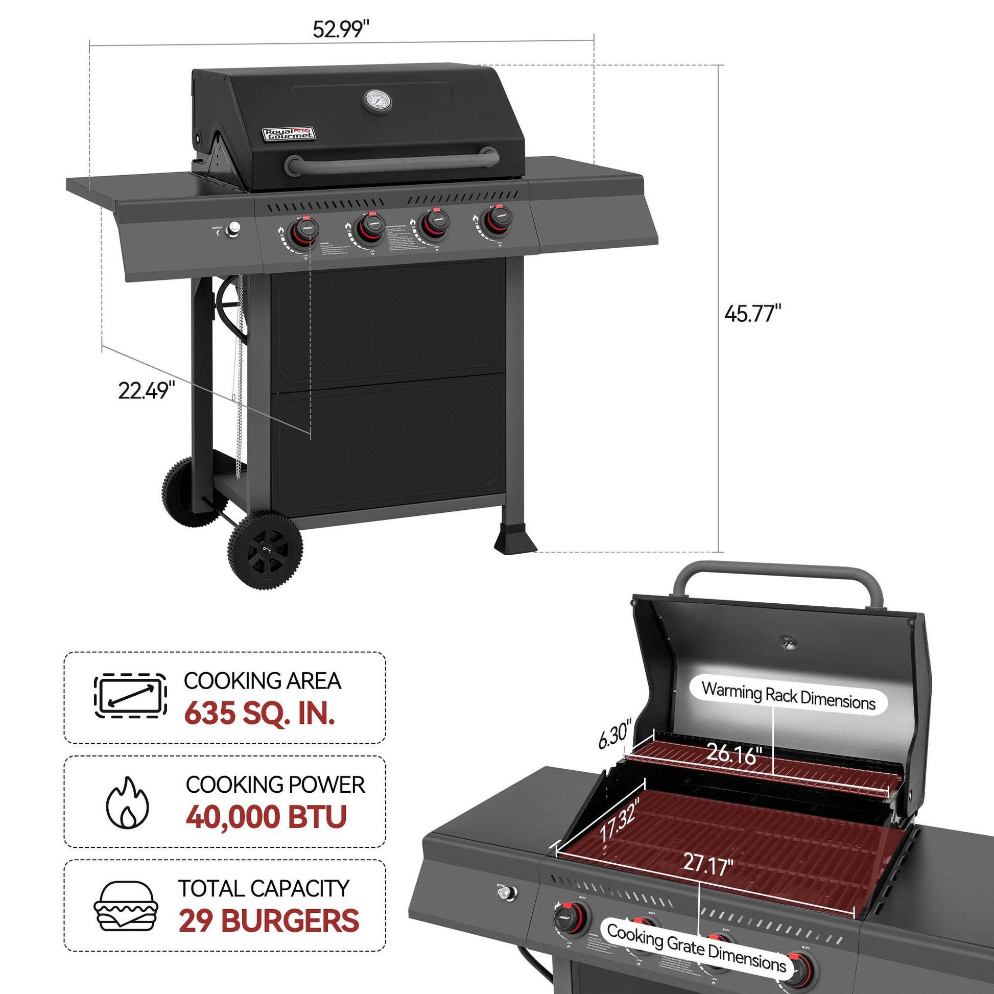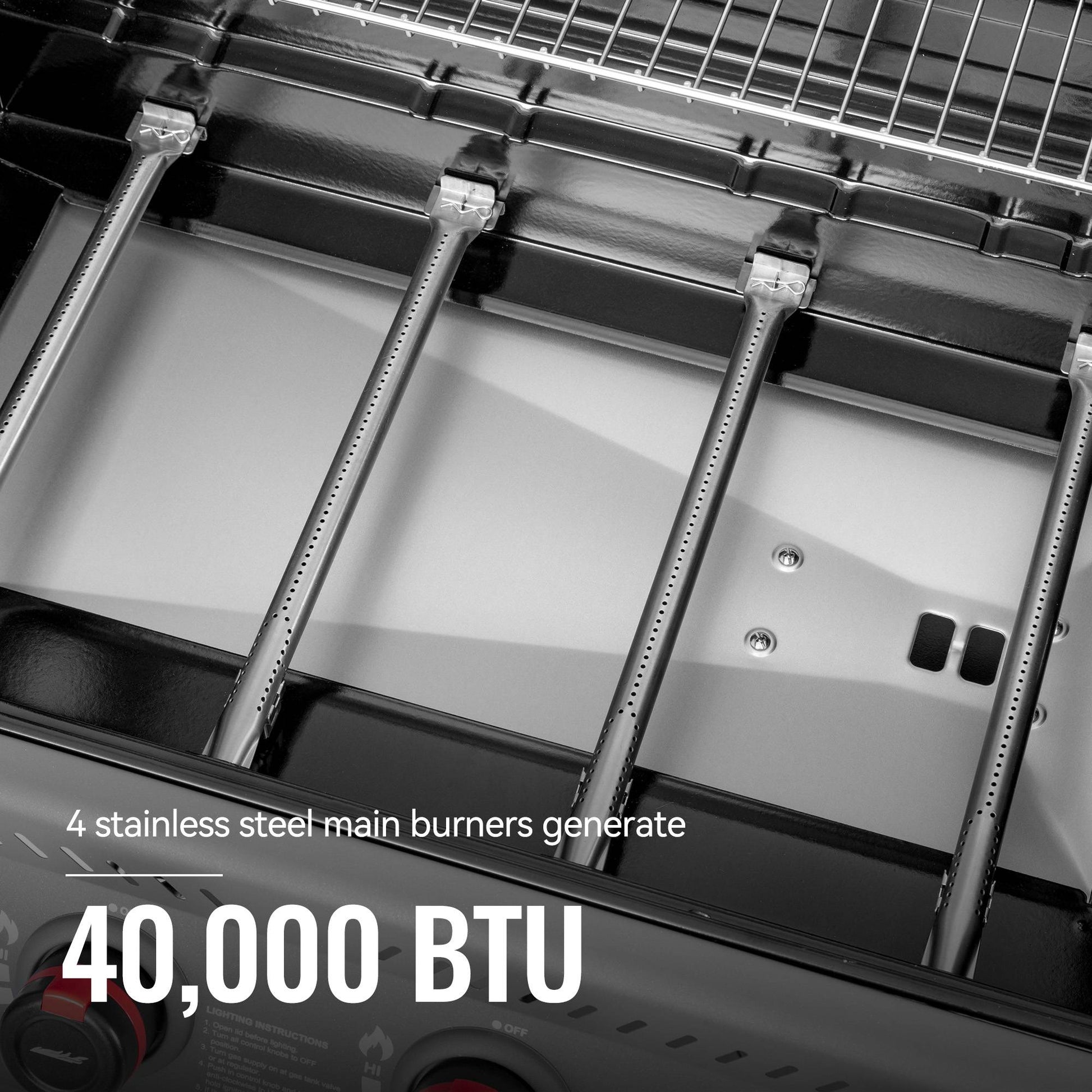 - 4 stainless steel burners deliver a total of 40,000 BTU output