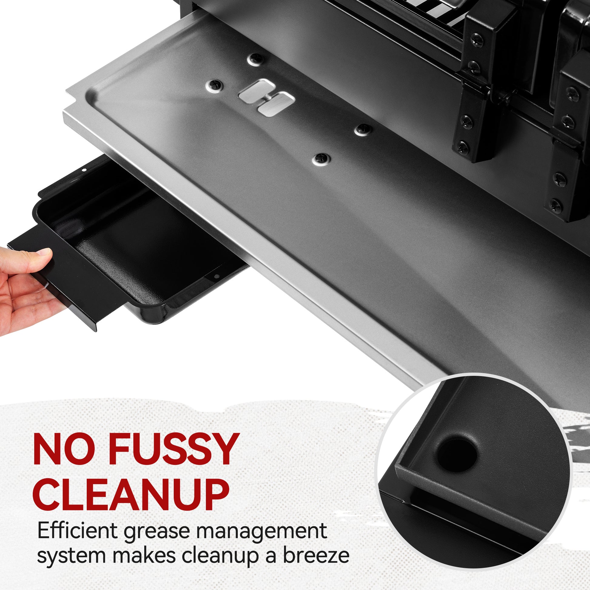 5.Hassle-free Cleanup: The oil leak hole on the griddle plate, along with the sizable grease tray and the removable grease cup, work together to make the cleaning job quick and easy.