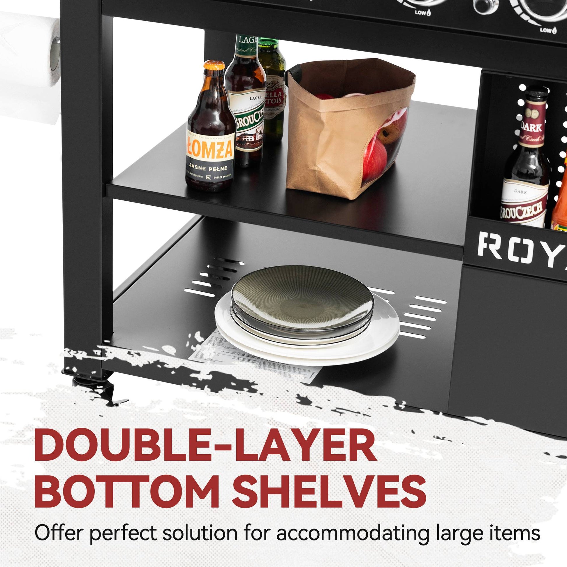 2. Upgraded Storage Cart: Our upgraded storage cart features plenty of storage space where you can organize grill essentials orderly and eliminate mess: double-layer shelves on the left, front spice rack on the right, a cylinder base behind the rack.