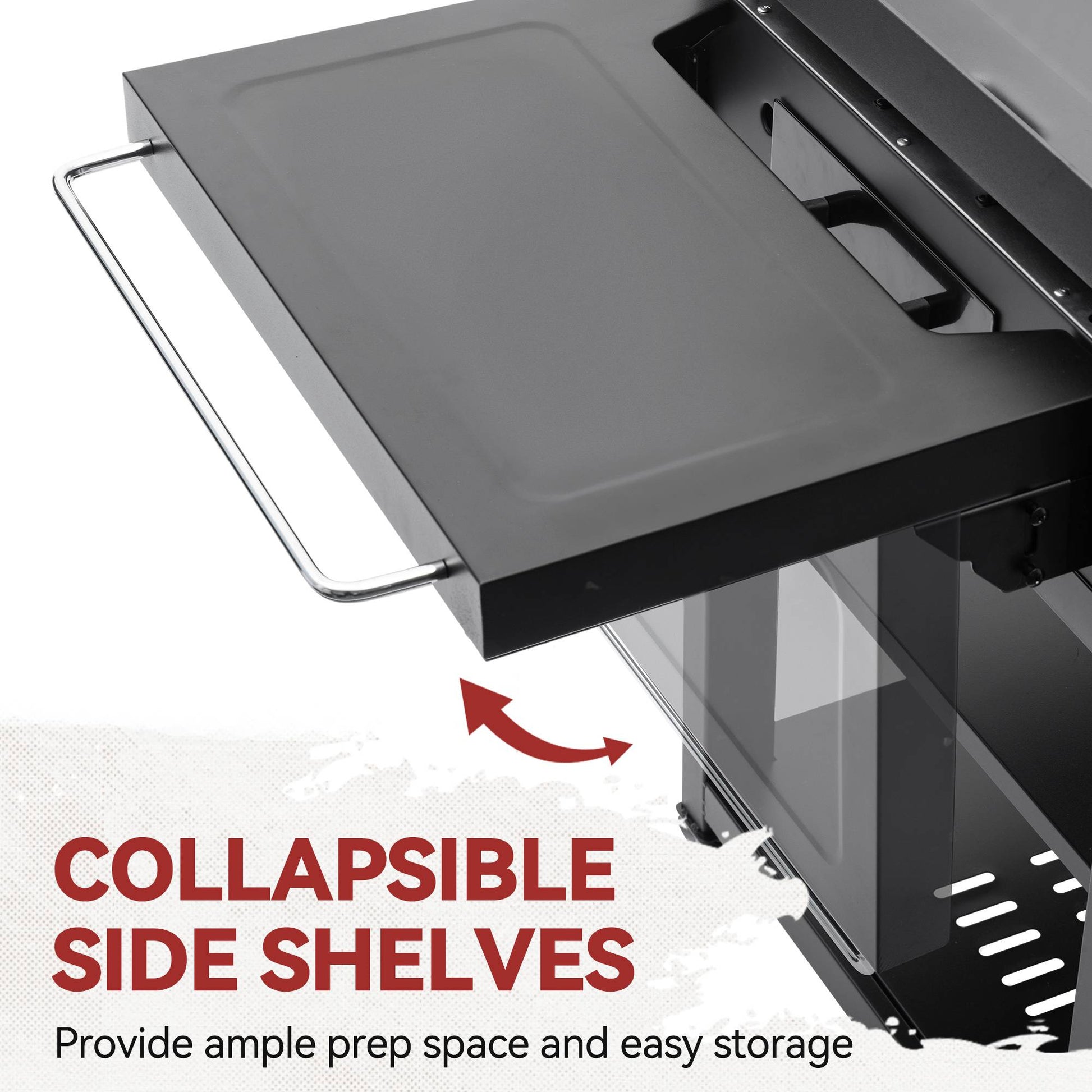 3. Versatile Side Shelves: Two side shelves, equipped with a towel rack, a knife holder and three tool hooks, keep cooking essentials handy and offer ample prep space to place seasonings, tools and plates. In addition, it can be folded down for better storage.