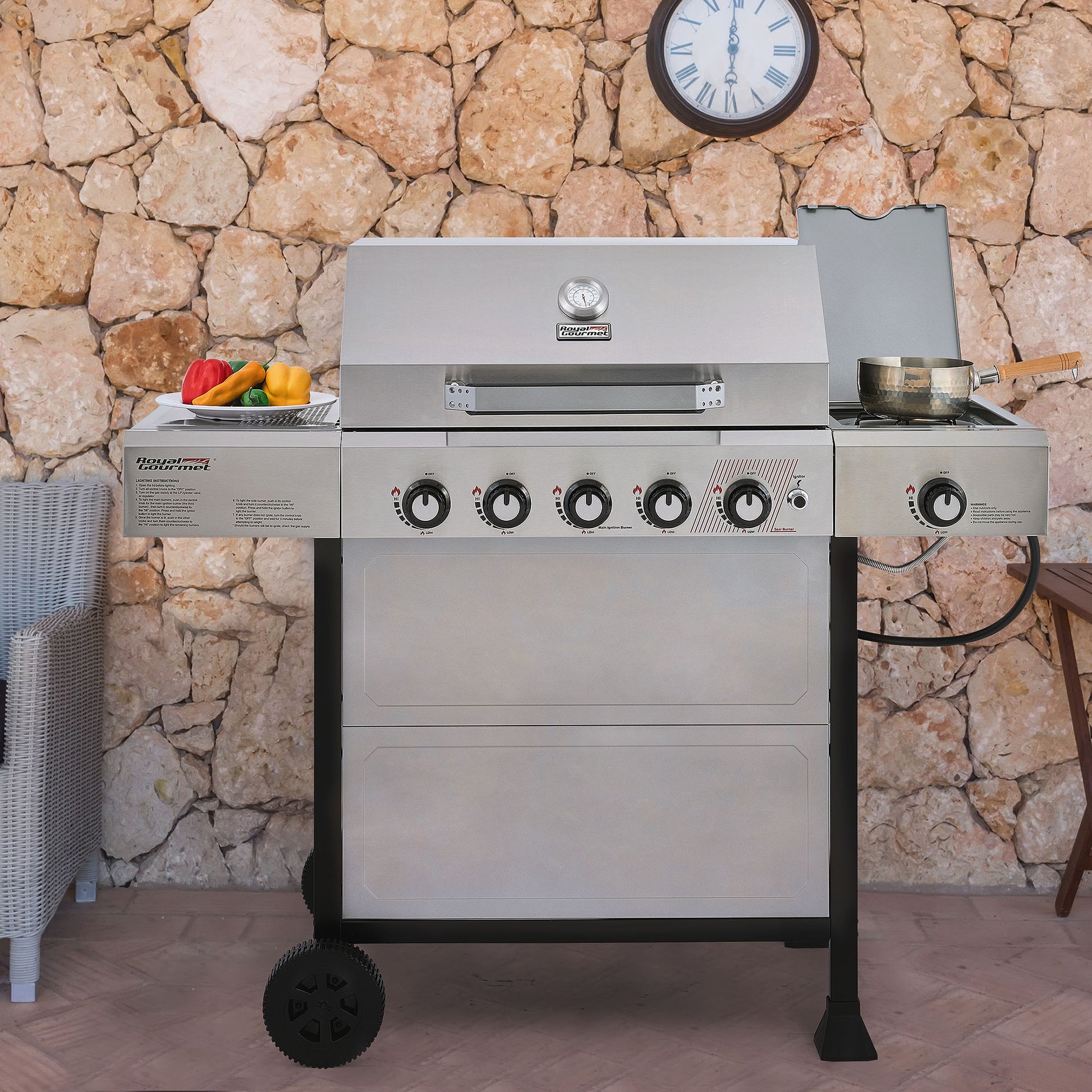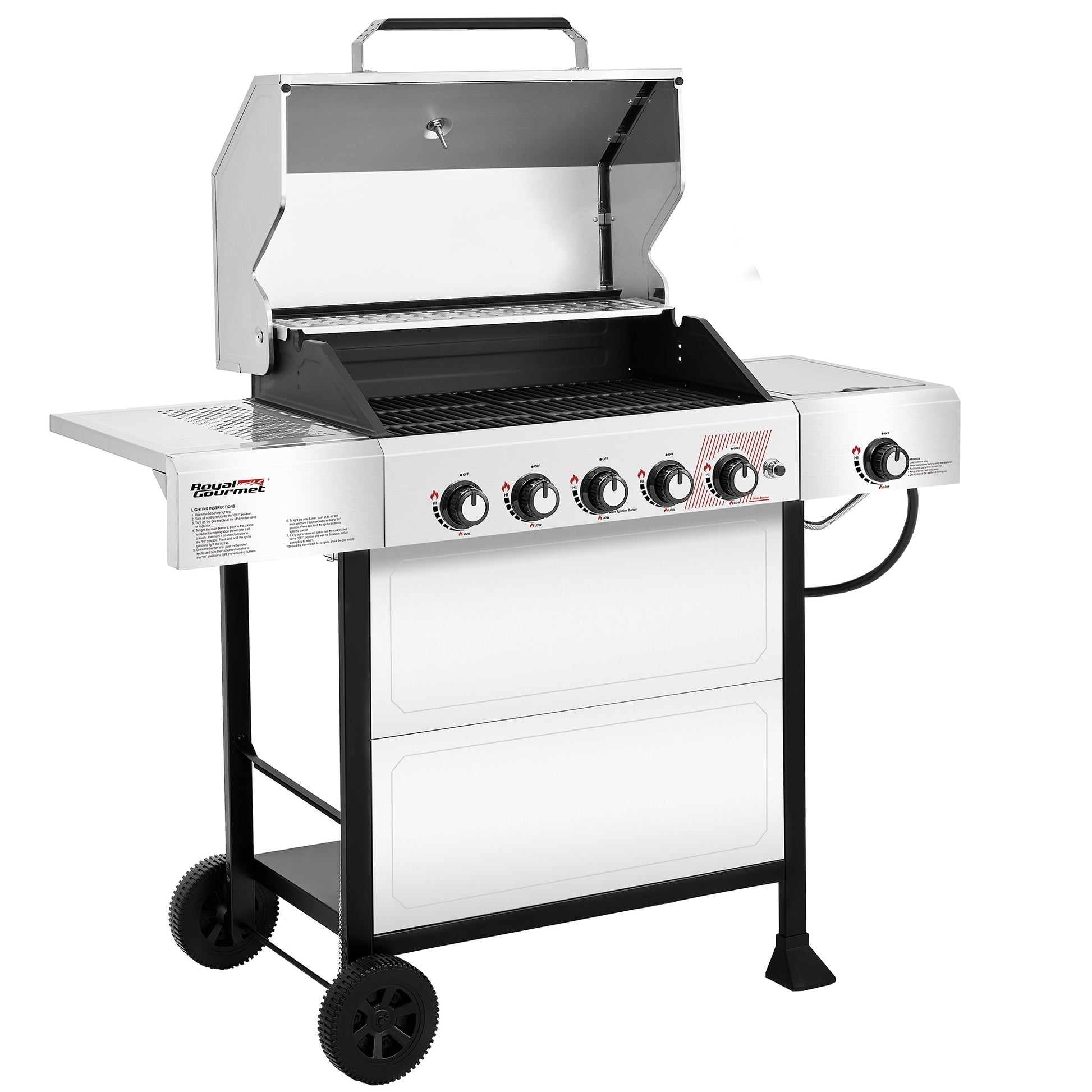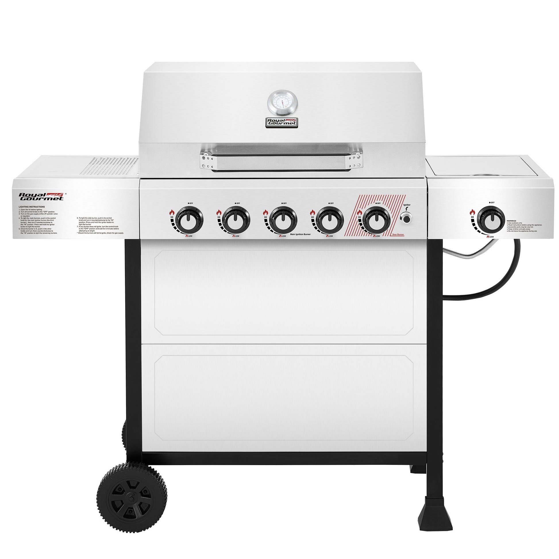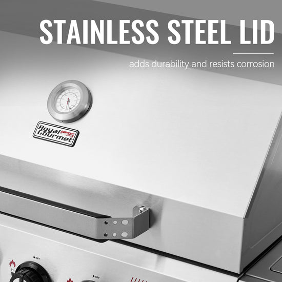 Serve up a full-course meal with the Royal Gourmet GA5401T—a 5-burner gas grill with a side burner. With a spacious grilling area, you’re free to cook a feast—from juicy steaks to savory sides, and yes, even dessert—all at once. High-powered main burners and a convenient side burner give you the flexibility to prepare your entire meal on one grill. Porcelain-enameled cast-iron grates retain heat and deliver those perfect grill marks, while the stainless steel warming rack keeps food warm and ready to serve. Worried about cleanup? Don’t be. The stainless steel lid and control panel wipe down in seconds, and the front panel helps block grease splatter—so all that’s left to do is enjoy the food and the moment.