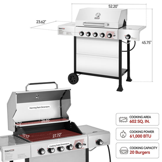1. Spacious Grilling Space: A total of 602 sq. in. cooking area, including a 476 sq. in. primary grilling surface and a 126 sq. in. warming rack, ensures you have ample room to grill for family and friends.