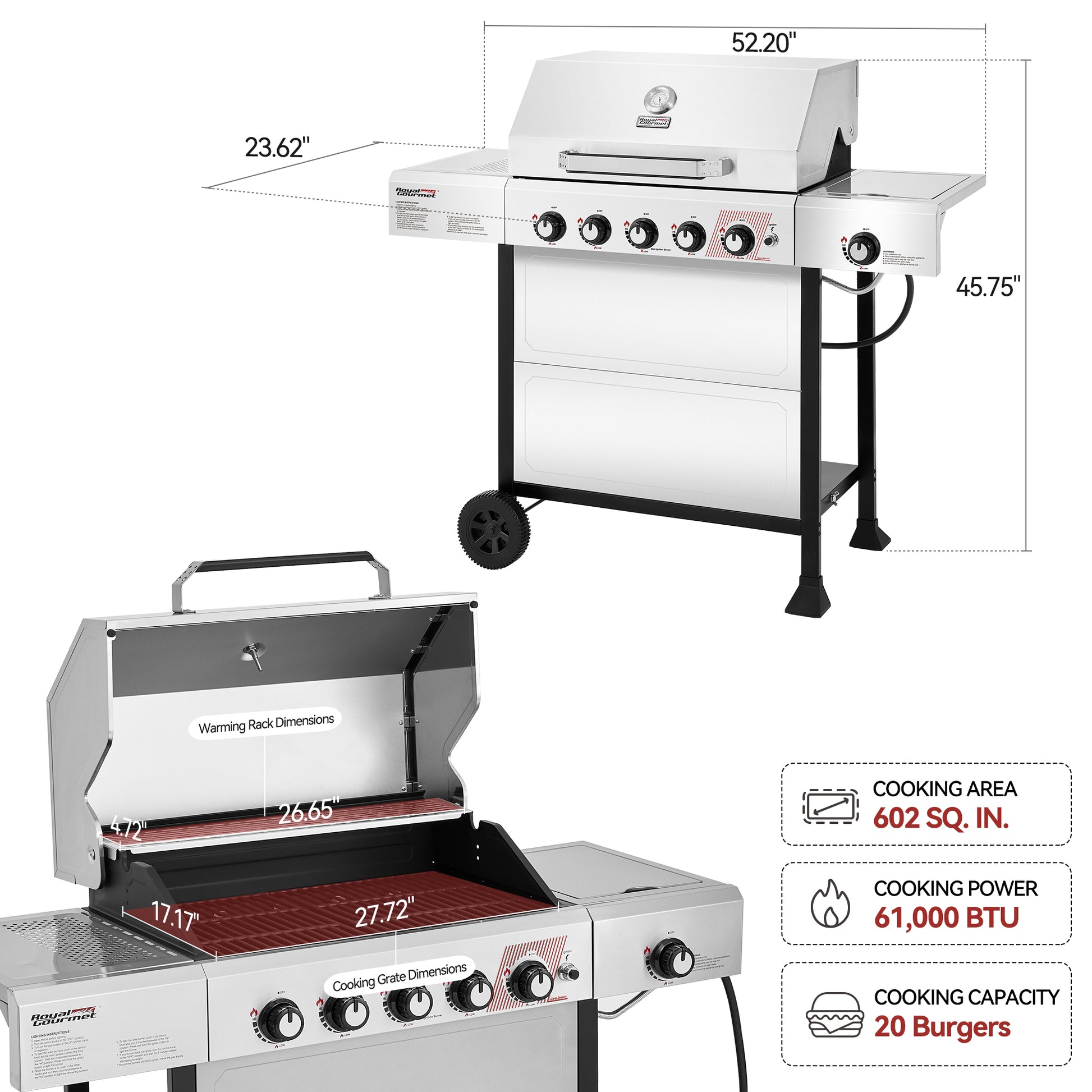 - Warming rack area: 26.65” L x 4.72” W