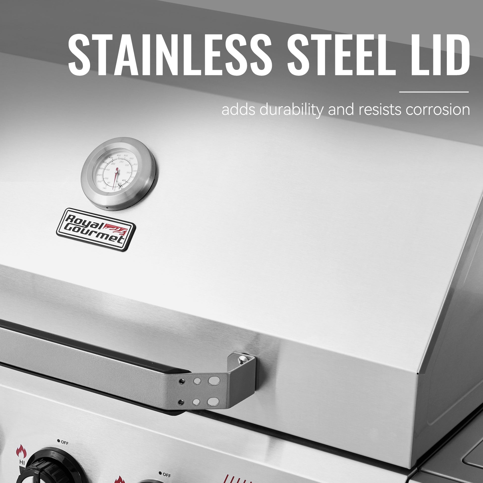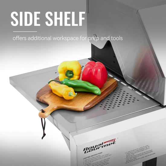 4. Extra Prep Space: Side shelf holds platters, seasonings, and grilling tools for easy access while cooking. Side burner features a lid, allowing it to double as additional prep space when not in use.