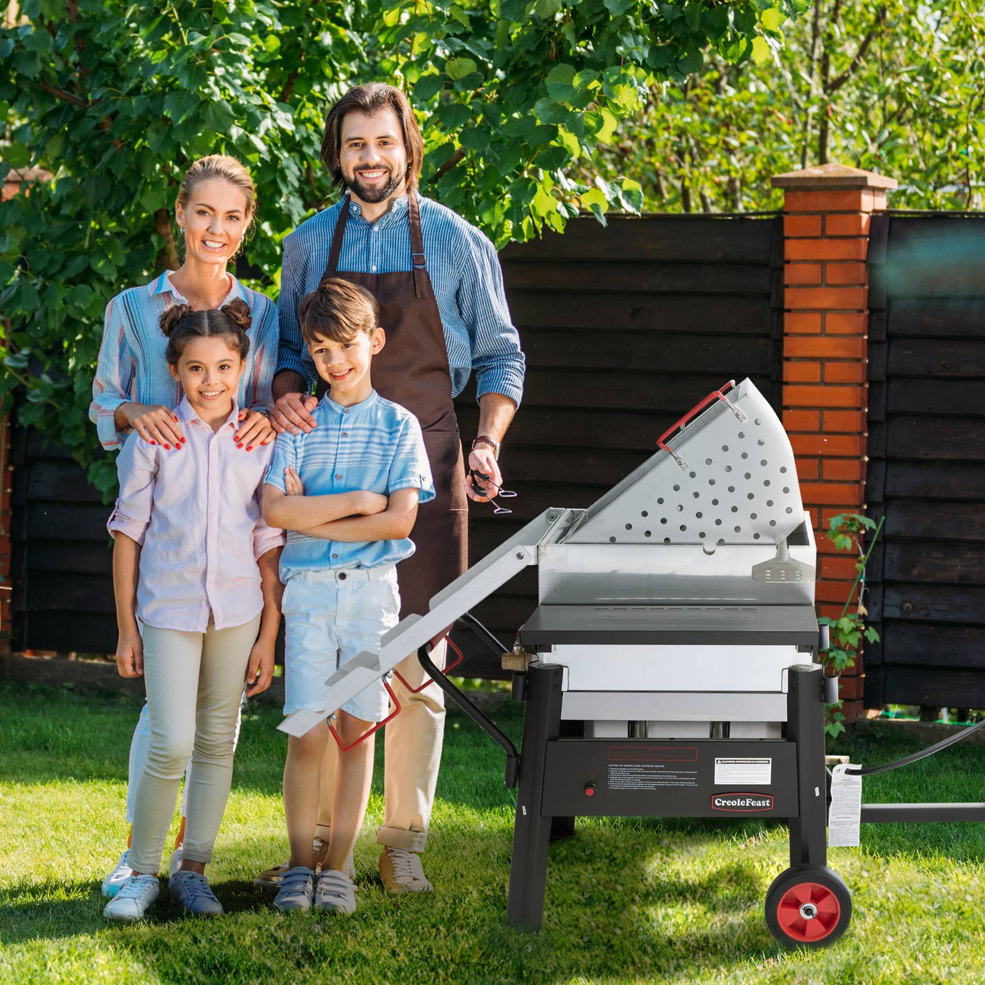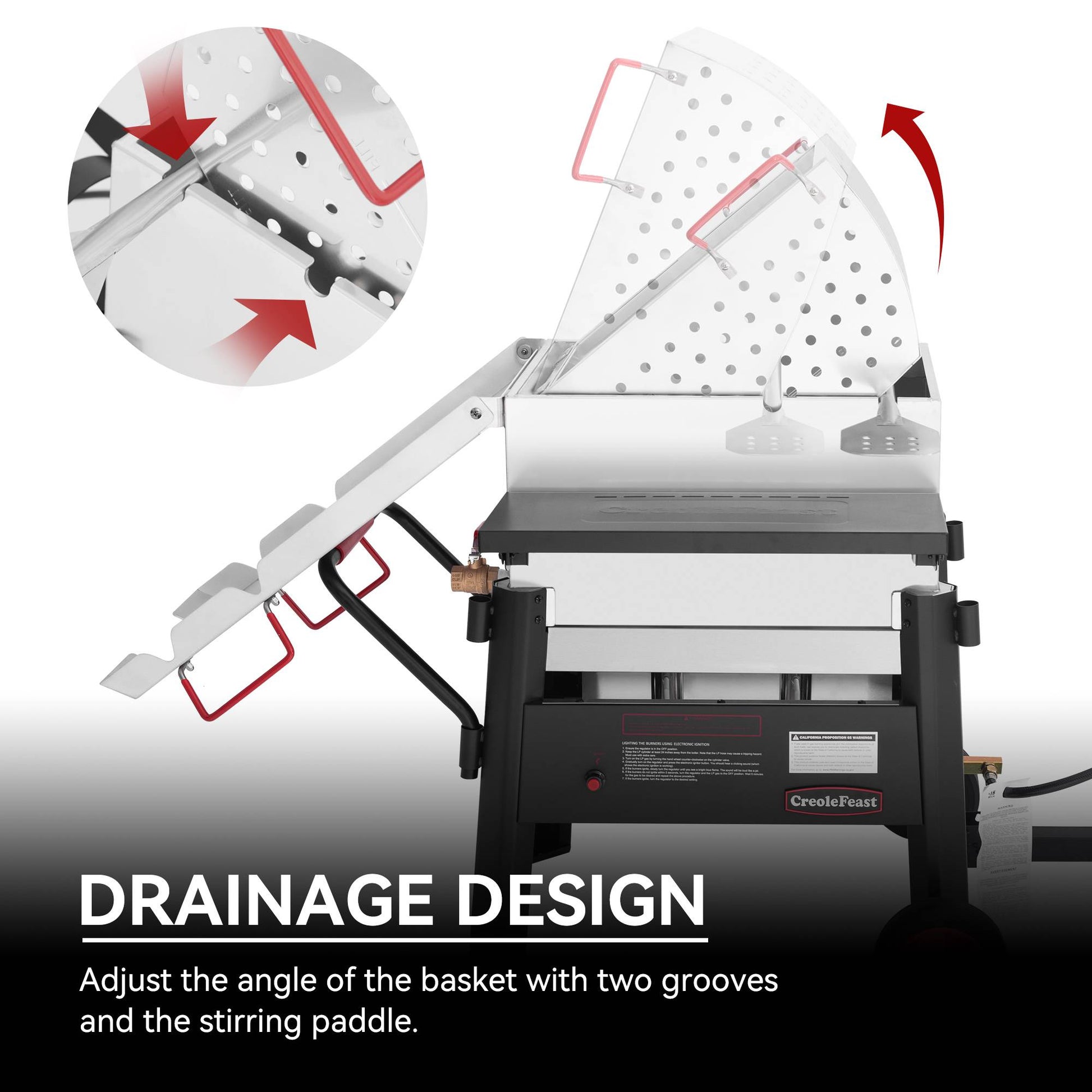 Now it's time to cook up a feast with the creole feast CFB3001 single sack crawfish seafood boiler, with a generous 70 qt. capacity shrimp cage, it can accommodate around 40 lbs. of lobsters or other seafood, cooking them to perfection in just 30-minutes, which is the perfect companion for your big family party. Operating is also a breeze with a height-adjustable handle, a stirring paddle, a side table, and other features. Practical and efficient enough for your every cooking.