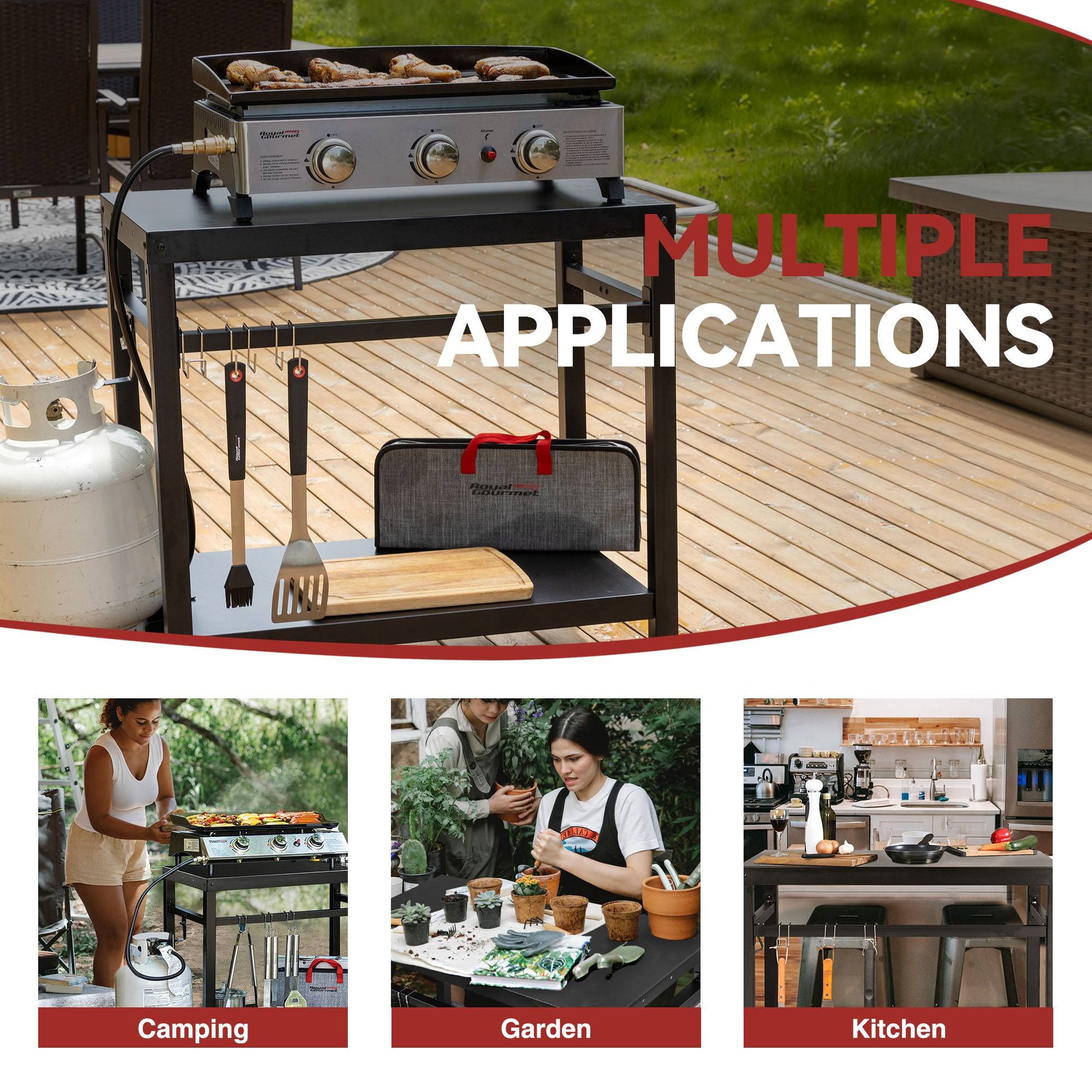 Enjoy the benefits of mobility and accessibility from the Royal Gourmet PC3401B movable dining cart work table, a handy and versatile complement to your backyard grilling, BBQ, parties, events, and other fun activities. This durable cart is constructed with rigidity and will not be easy to fracture or rust under proper maintenance. The tabletop measures 659 sq. in. and could bear a maximum weight of 77 lbs., which is enough for daily family needs. Besides, this worktable is perfect to use with portable grills or griddles considering that it provides mounting brackets for gas cylinders of up to 20 lbs.