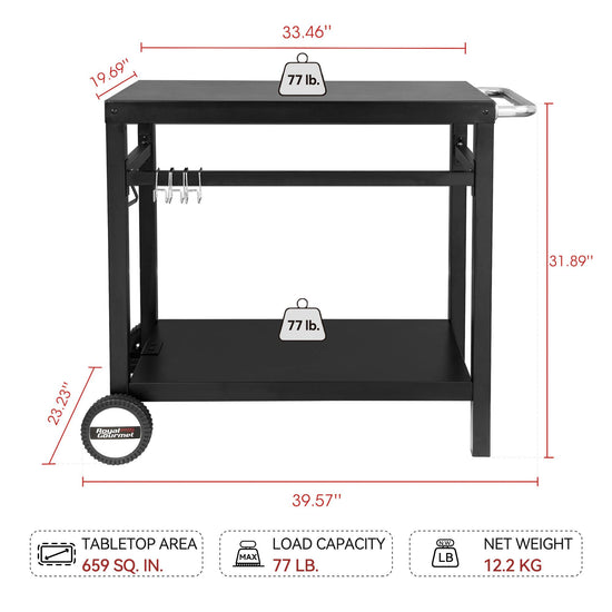 - The 659 sq. in. tabletop provides considerable space to place a portable grill, an oven, or prepare food. The double-shelf structure design also offers enough room for large accessories on the bottom shelf.