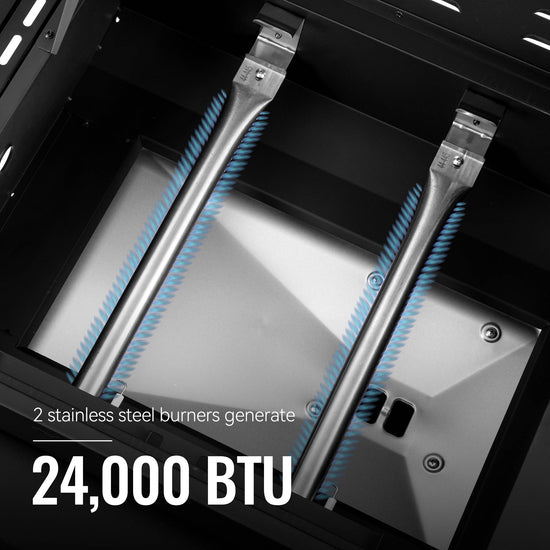 3.Fast & Robust Heat: Featuring 2 stainless steel main burners (12,000 BTU each) and a side burner (10,000 BTU), this grill delivers 34,000 BTU robust power in total. Piezo ignition system makes it easier than ever to fire up the grill without the need for battery.