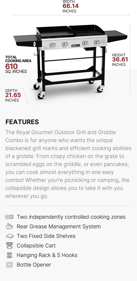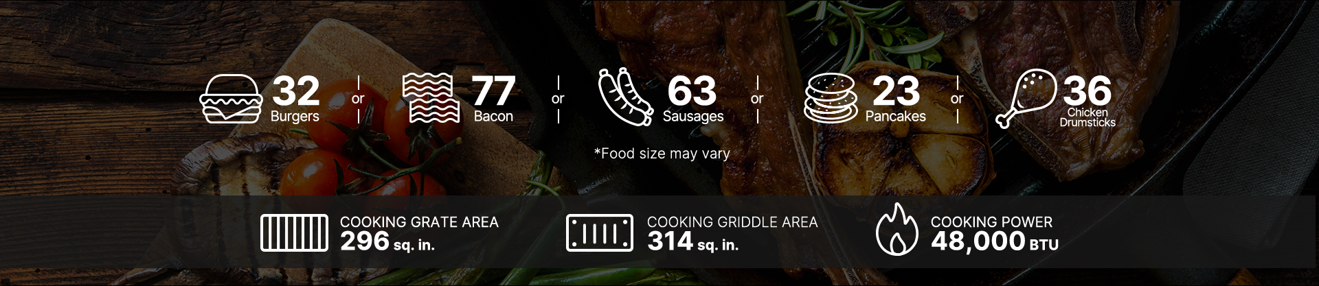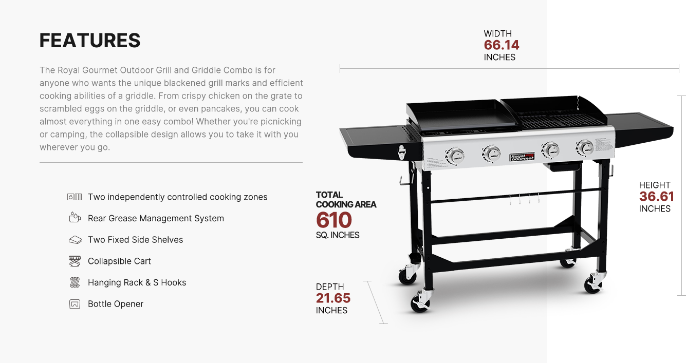 - Primary Cooking Area 17.60” L x 16.61''(Grill) 18.90” L x 16.61''(Griddle)
