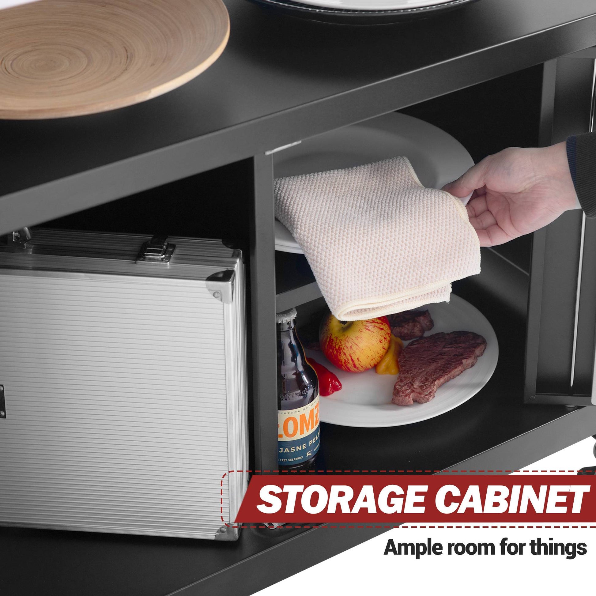 - Ample Storage Space: The cart incorporates a spacious storage cabinet with doors, offering additional storage room for grilling accessories, beverages, or party items, ensuring efficient organization and easy accessibility.