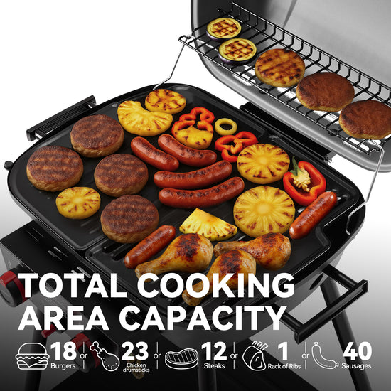 1.Spacious Cooking Area: With a total of 346 sq. in. cooking area, including 136 sq. in. cooking grate area, 136 sq.in. cooking griddle area and 74 sq. in. warming rack area, this grill holds up to 18 burgers at once.