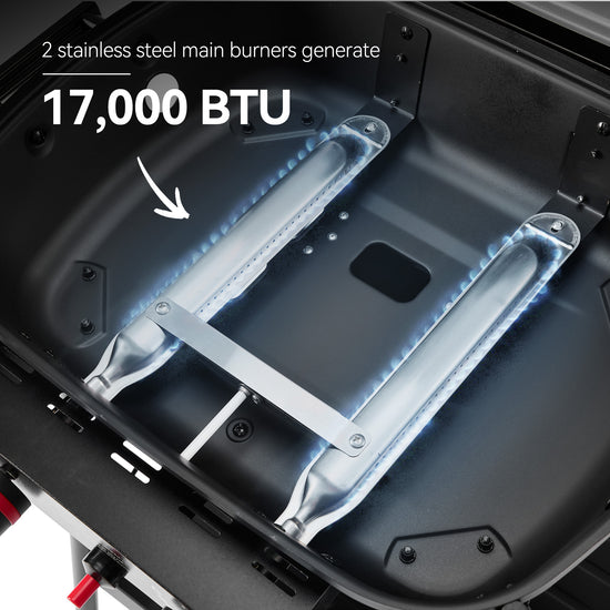 2.Powerful Cooking Performance: 2 main burners offer 8,500 BTU each, generating a total of 17, 000 BTU cooking power. All burners are made of stainless steel for long-lasting performance.