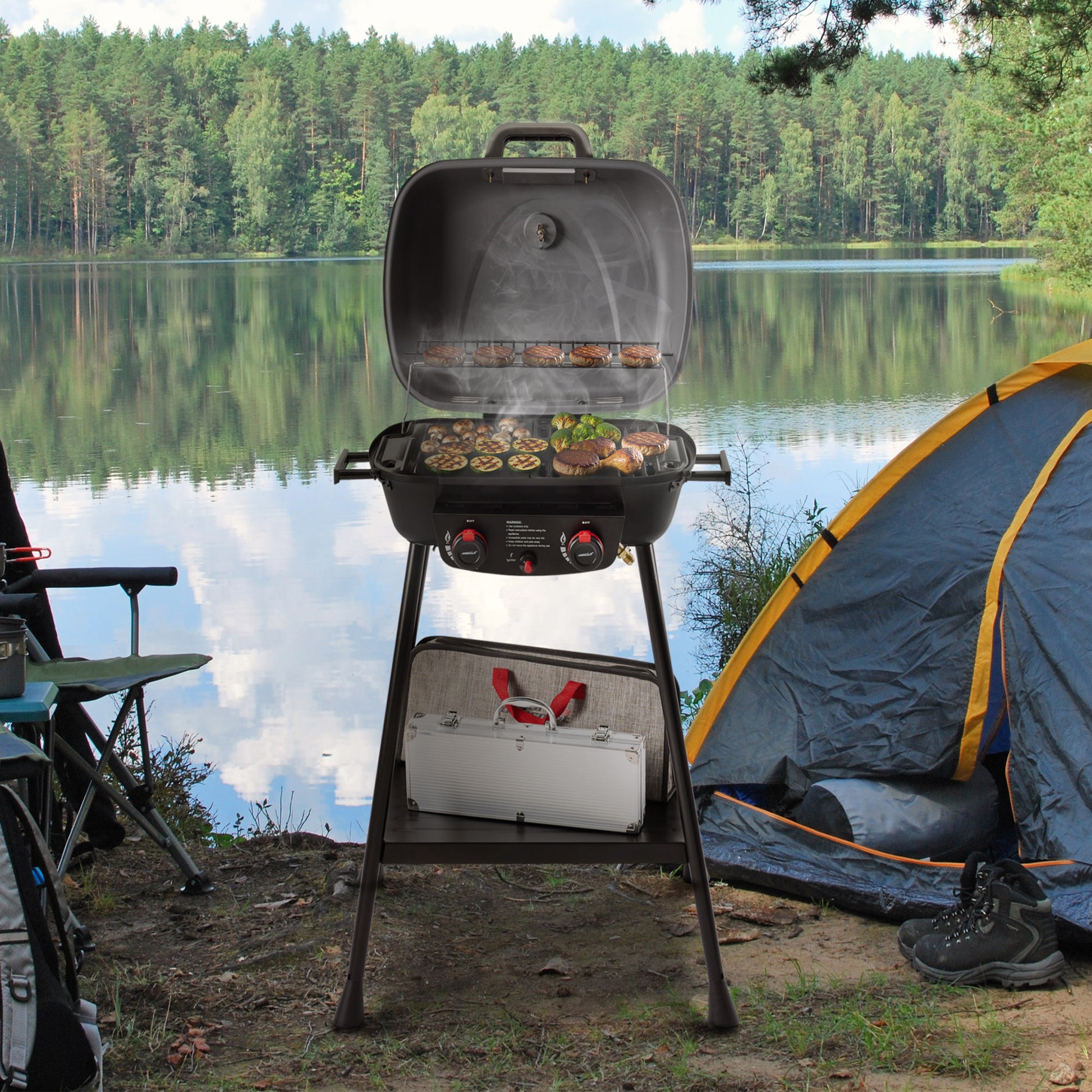 Portable 2-Burner Gas Grill with Stand and Shelf, Gray