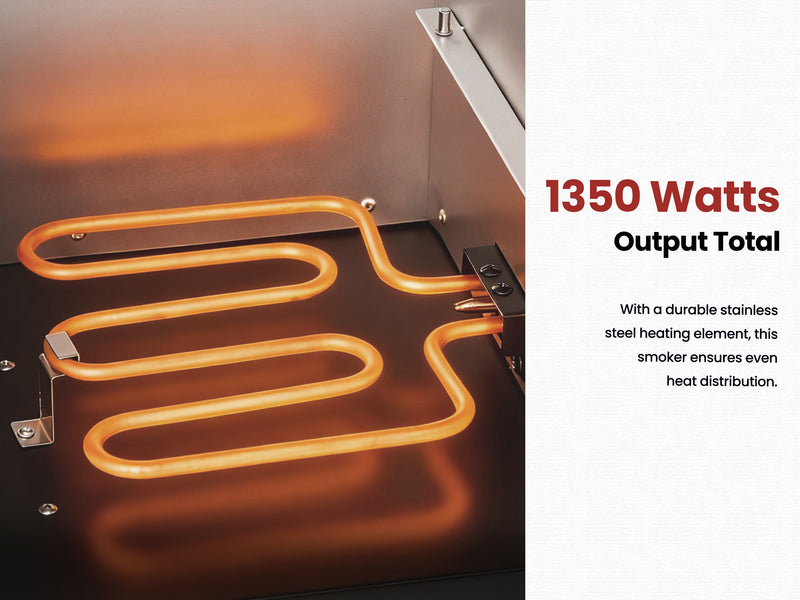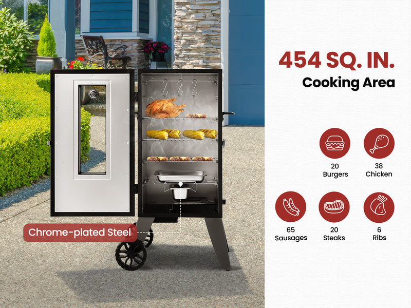 Professional 28-inch electric smoker with 454 sq. in. capacity. 1350-watt heating element delivers consistent results for ribs, brisket, chicken, and vegetables.