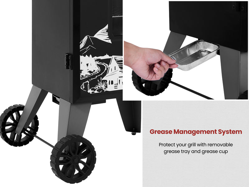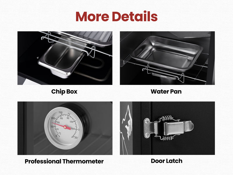 - Wood chip box and water pan for rich, moist flavor
