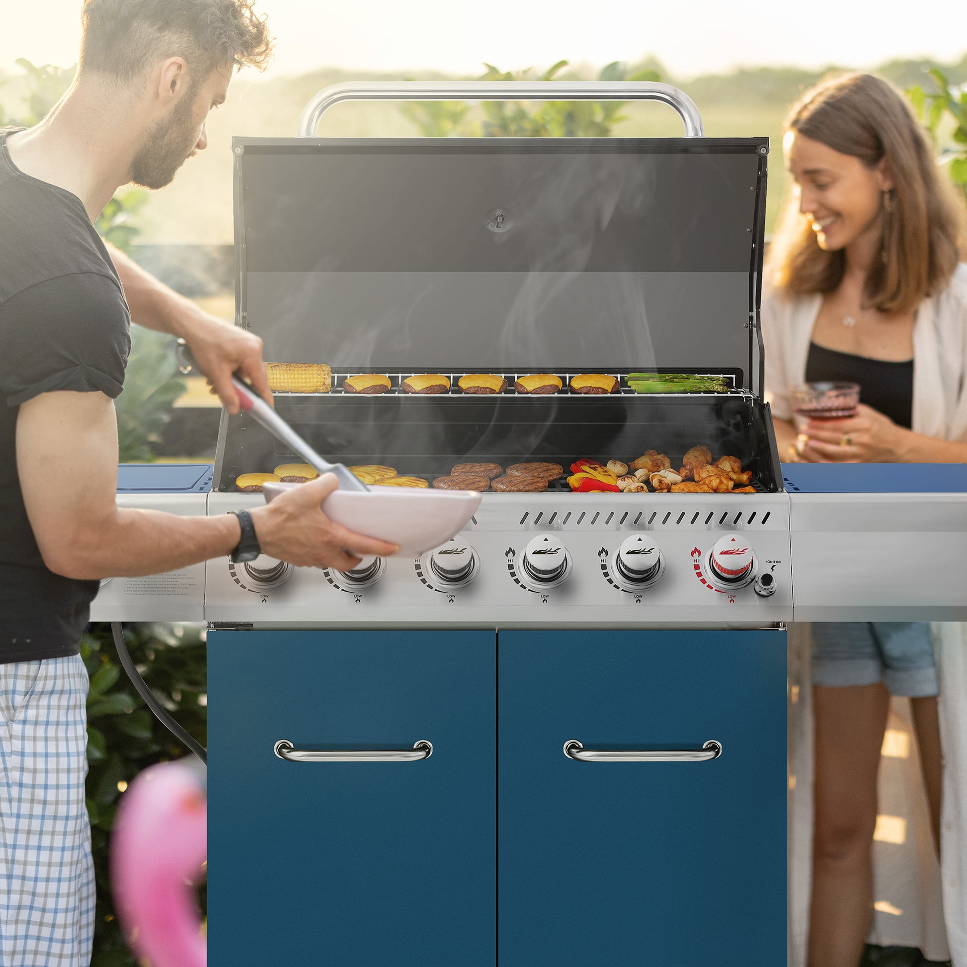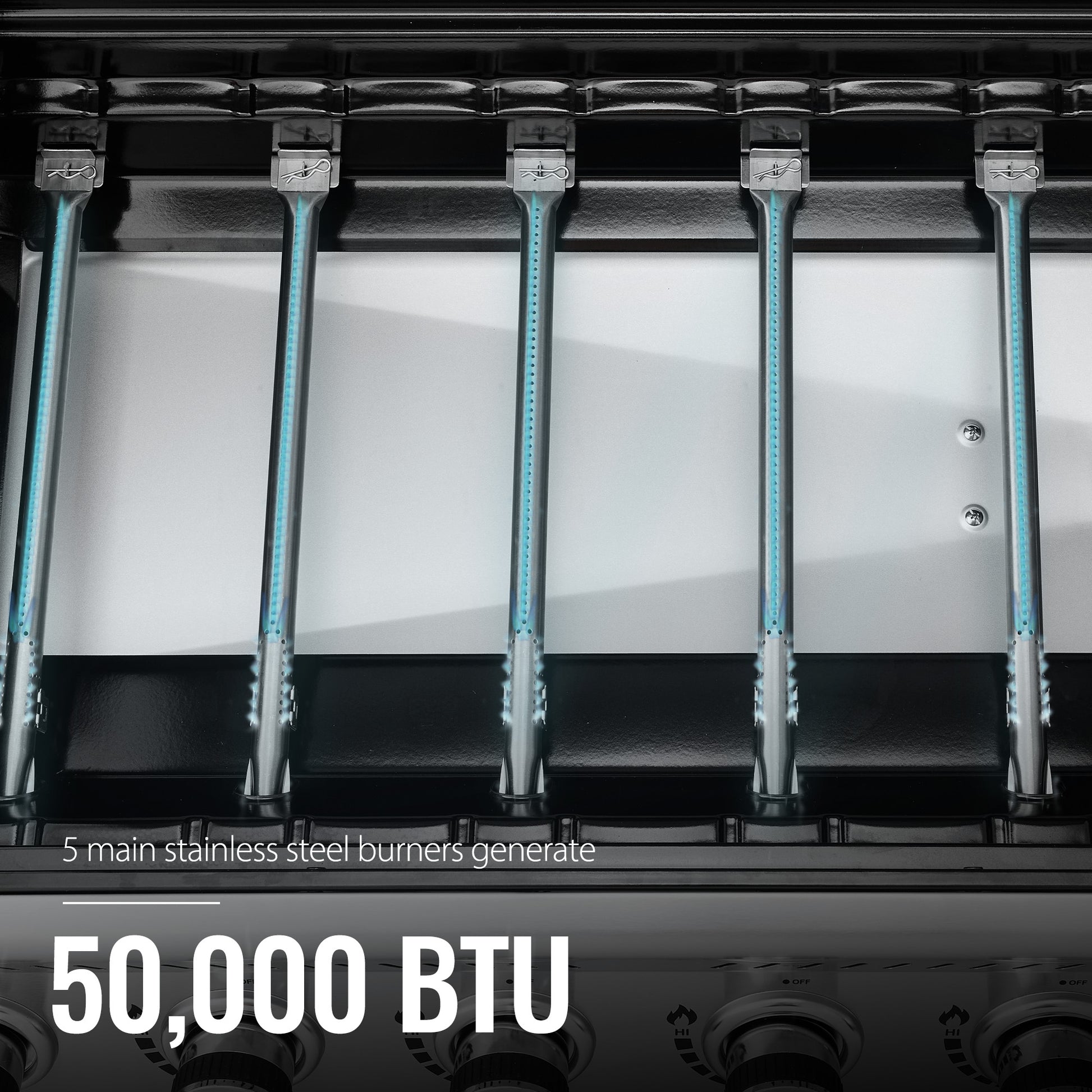- High Cooking Output: 5 tube burners (10,000 BTU each) + 14,000 BTU sear burner + 10,000 BTU side burner