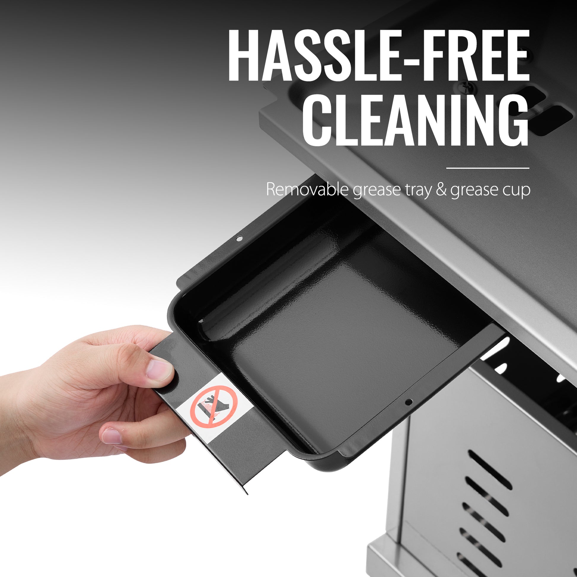 - Easy Cleanup: Removable grease tray and cup minimize flare-ups and simplify post-cook cleanup