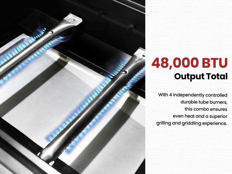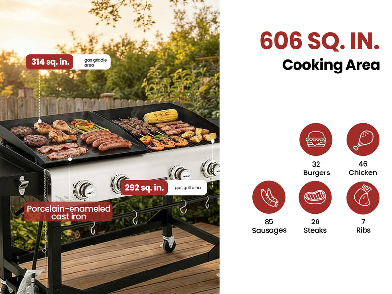 - Dual Cooking Zones: 292 sq. in. ribbed grill + 314 sq. in. flat-top griddle