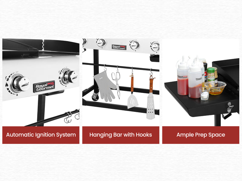 The Royal Gourmet® GD401 combines a flat-top griddle and a ribbed gas grill in one portable unit — cook pancakes and steaks at the same time, anywhere you go.